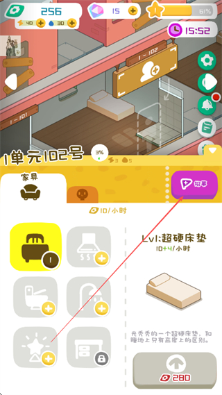 2、在房间界面,选择家具如超萌床垫进行布置,提升房间等级。