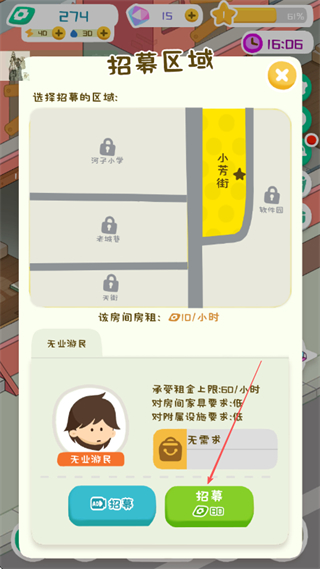 3、进入招募区域,选择无业游民房客,点击招募按钮发起招募。