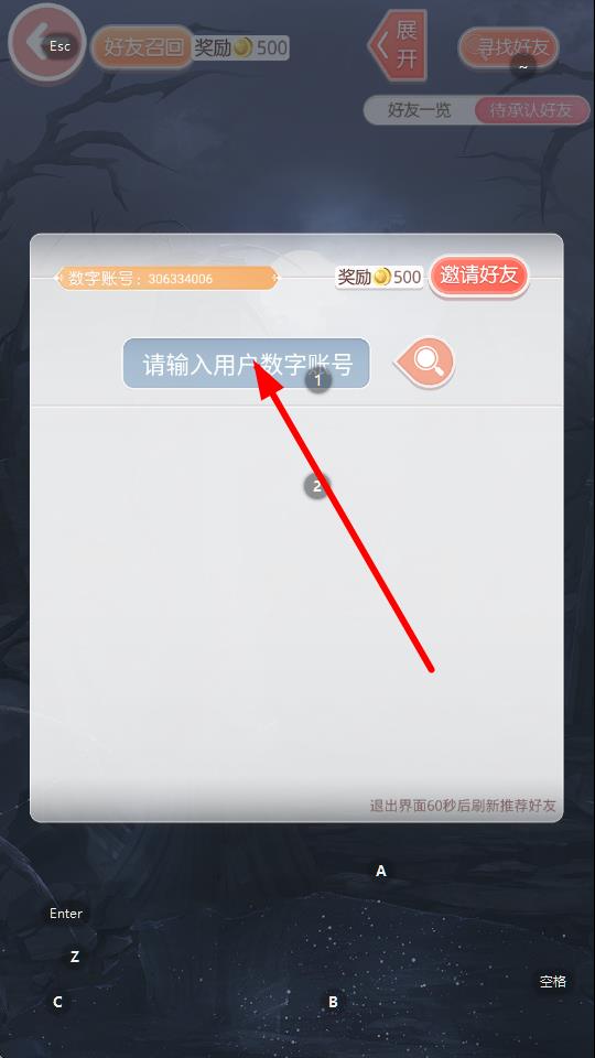 3、在弹出的添加好友界面中,在请输入用户数字账号输入框里,输入你想添加好友的数字账号,然后点击旁边的搜索按钮,找到对应好友后发送添加申请即可。