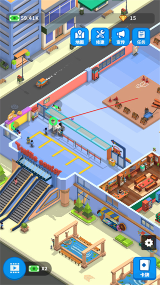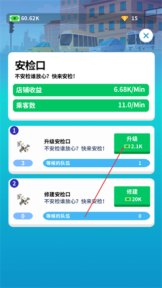 2、在安检口界面点击升级,消耗资源提升安检口等级,增加收益与客流。