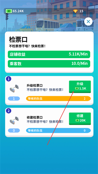 3、点击检票口建筑进入界面,同样点击升级提升检票口等级,优化运转效率。