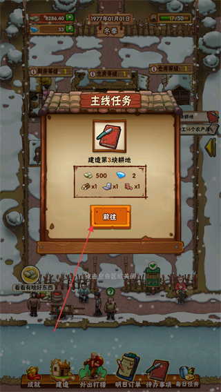 1、点击底部建造按钮,进入主线任务界面,选择建造第3块耕地任务,点击前往。