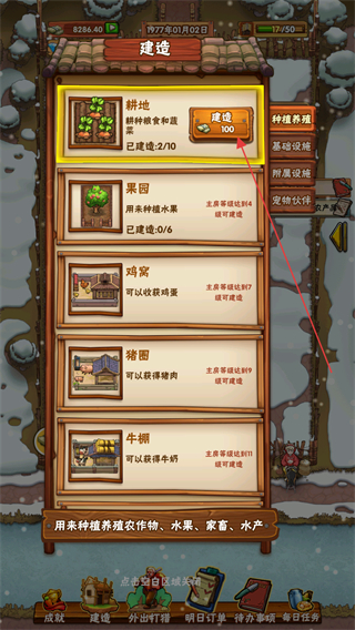 2、在建造界面中,选择耕地选项,消耗100金币点击建造,完成耕地解锁。