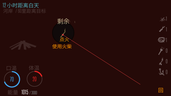 4、当需要生火时,看到12小时距离白天等信息,点击点火使用火柴按钮,利用道具维持生存状态。