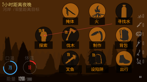1、规划时间管理状态:进入后,首先关注体温和卡路里数值,根据当前状态规划时间,决定优先采集食物补充能量,还是搜集资源为后续做准备,确保生存状态稳定。