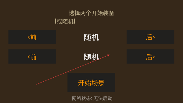 1、在选择界面点击随机按钮来确定两个开始装备,或手动选择,之后点击开始场景进入游戏。