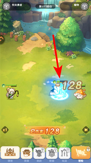 4、战斗过程中,角色会自动释放技能攻击怪物如图中技能造成128点伤害,这是推进战斗的核心环节,持续攻击直至击败怪物,即可完成挑战并获取对应的奖励资源。