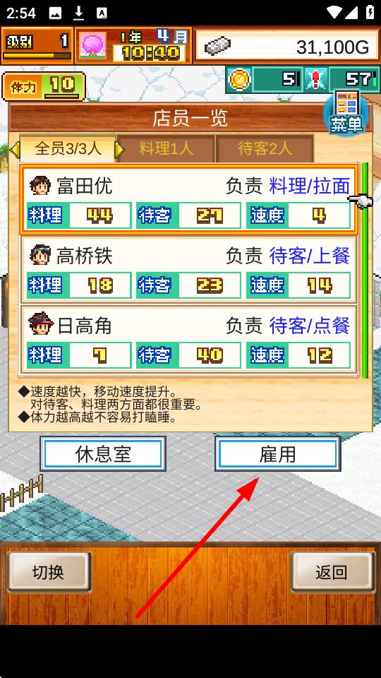 3、进入店员一览界面后,点击下方的雇用按钮,即可进行新员工的雇佣,壮大店铺的员工队伍。