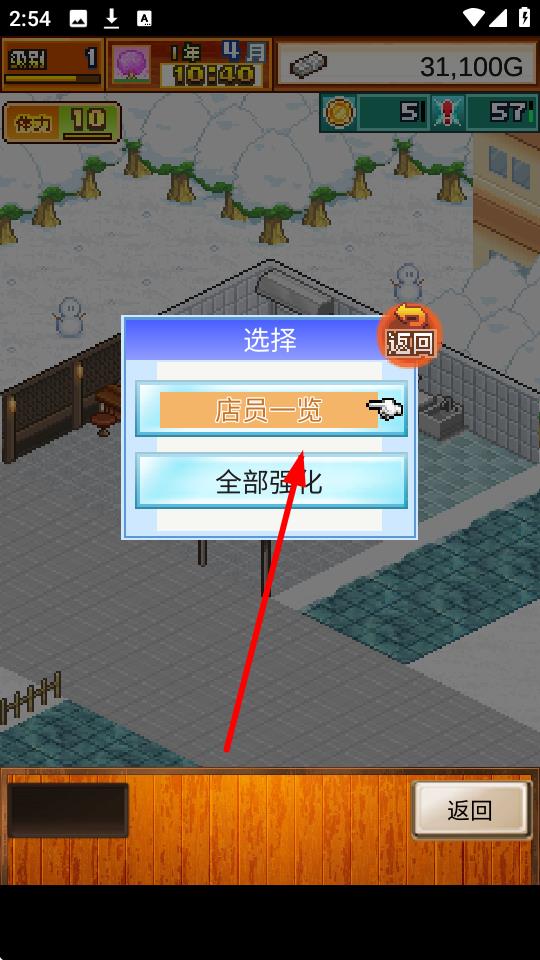 2、点击后出现的选项中,选择店员一览选项,通过这一入口可以查看当前店员的情况以及进行新员工的雇佣操作。