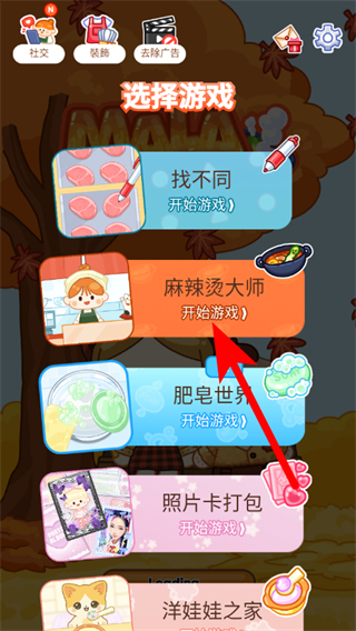 1、在游戏选择界面,点击“麻辣烫大师”的开始游戏按钮,进入游戏。