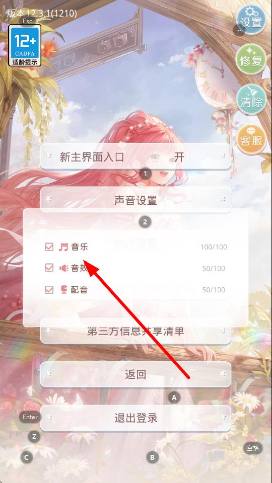 3、进入声音设置界面后,可对音乐音效配音进行设置,还能拖动滑块调节它们的音量大小,设置范围为0-100。