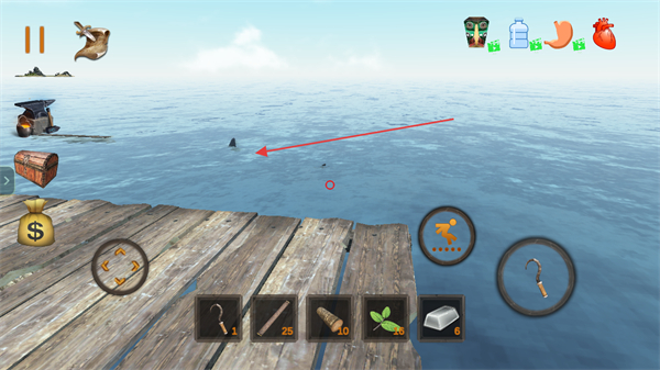 4、继续瞄准海上目标如鲨鱼附近区域,钩取更多物资推进生存进度。
