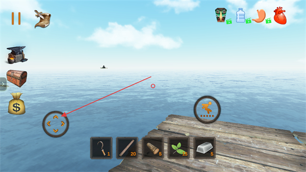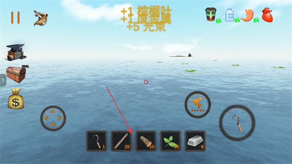 2、在木筏界面,选择钩子类工具,瞄准海上物资区域。