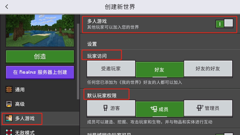4、在右边栏目框中选中【多人游戏】,左边栏目框将会对于多人游戏的一些参数进行设置,选择完毕点击【创造】即可。