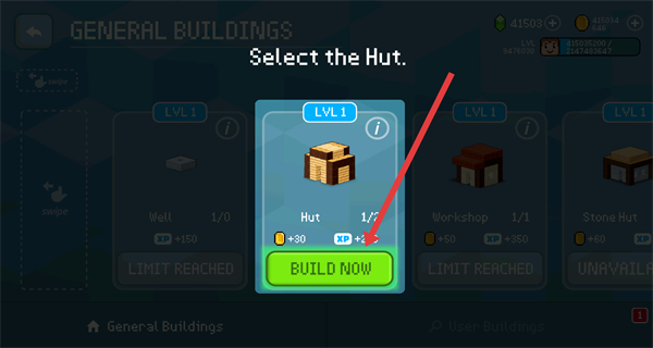 2、在建筑选择页面,选择“Hut”建筑,点击“BUILD NOW”。