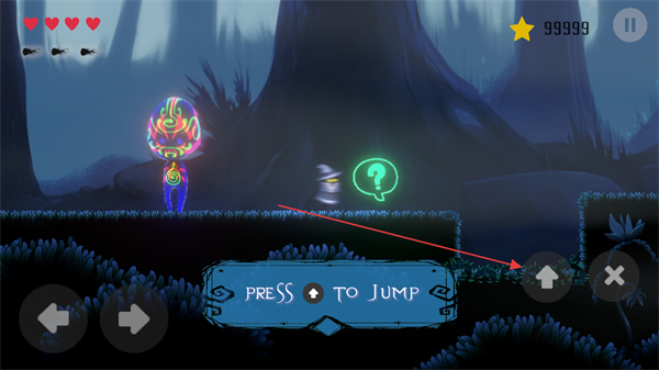 2、根据提示PRESS↑TOJUMP,点击向上按钮让角色跳跃,跨越障碍。
