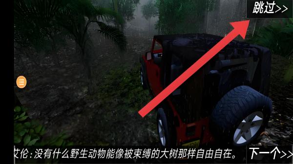 3、面对雨林场景的剧情展示,点击右上角跳过按钮,快速略过对话内容,直接进入正式游戏阶段,推进游戏进程。