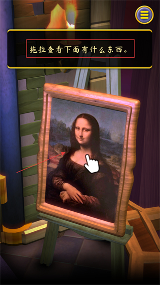 2、按照提示拖拽查看下面有什么东西,拖拽这幅画,露出画作后方隐藏的物品。