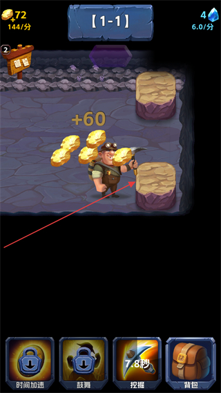 4、使用挖掘技能后,矿工开采矿石获得+60金币,持续积累资源推进关卡。