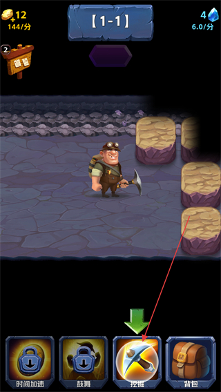 1、在1-1关卡中,点击矿石堆,操控矿工开采资源,积累金币与钻石。