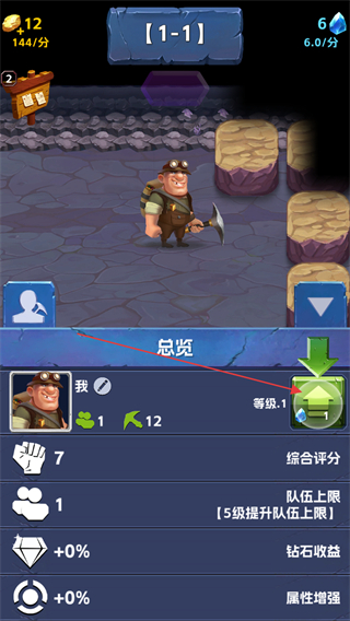2、打开总览界面,消耗钻石提升角色等级,增强开采相关属性。