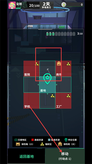 2、在地图界面点击移动按钮,消耗行动点前往不同区域。