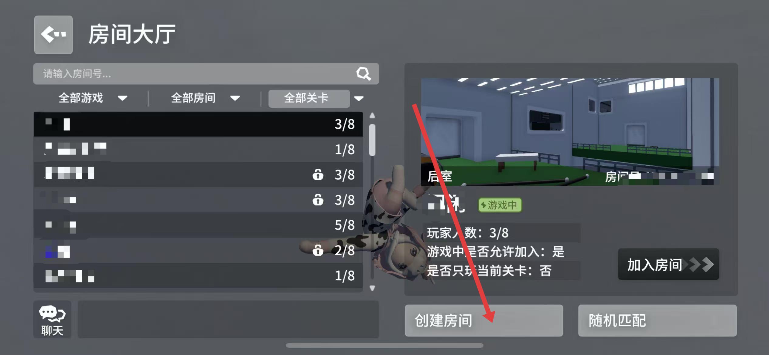 3、点击组队模式后来到房间大厅,有创建房间和随机匹配按钮,选择并点击创建房间按钮。