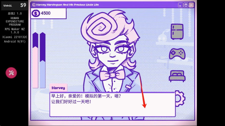 3、阅读角色Harvey的对话内容,了解游戏的日常模拟设定,跟随对话指引可开启新的一天,体验生活模拟玩法。