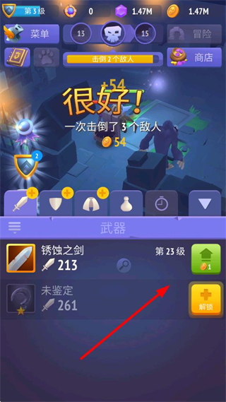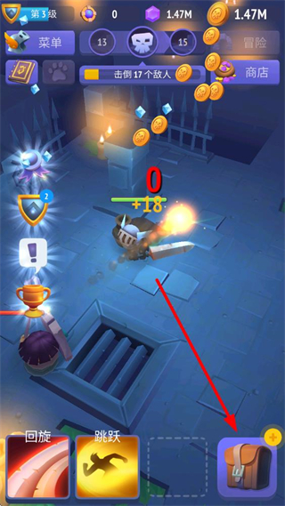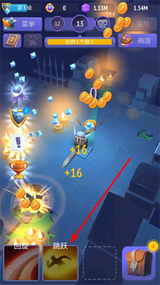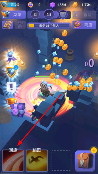 1、回旋按钮点击可发动范围攻击,面对扎堆敌人时使用能同时打击多个目标,获取大量金币与经验。
