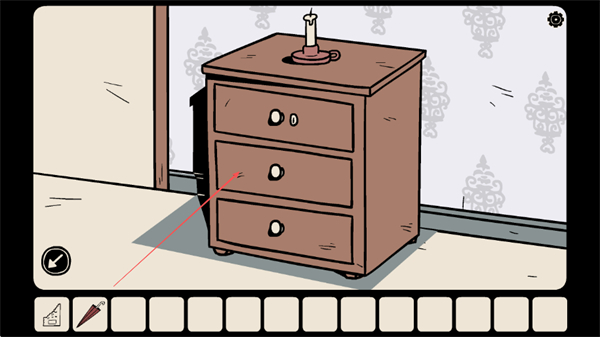3、点击床头柜的抽屉,尝试打开它,寻找解谜所需的物品。