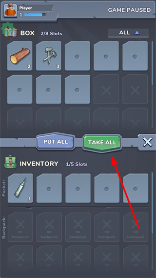 4、搜索到的资源与物品,点击TAKE ALL可快速将收集的资源放入背包,合理分配背包空间,优先携带制作关键装备的材料。