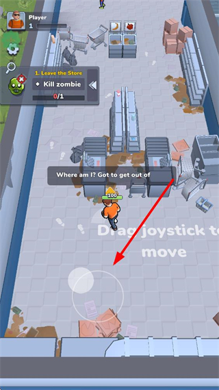 1、虚拟摇杆拖动可控制角色移动,在商店、野外等场景中自由穿梭,寻找资源点与出口,移动时需观察周围僵尸分布。