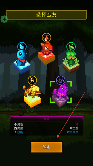 1、在选择战友界面,选中攻击型的紫色像素兽,点击确定选定战友。