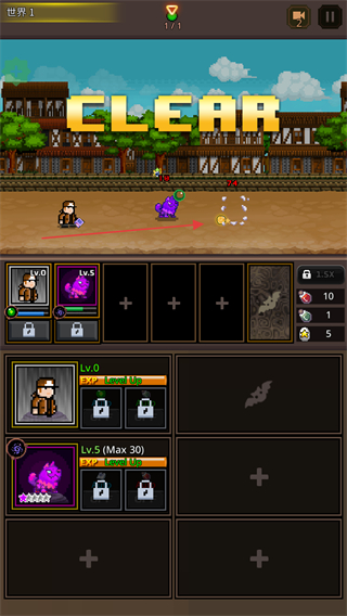 4、击败敌人后触发CLEAR通关提示,获取奖励用于培养像素兽。