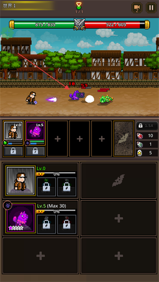 2、进入世界1关卡,操控角色与像素兽协同作战,对阵敌方怪物。
