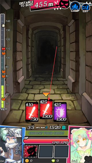 1、在走廊中选择卡牌如+25攻击的卡牌,消耗资源提升属性,同时推进与Boss的距离。