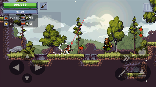 1、操控角色移动,攻击场景中的怪物,获取苹果类道具。