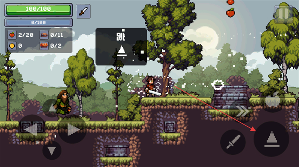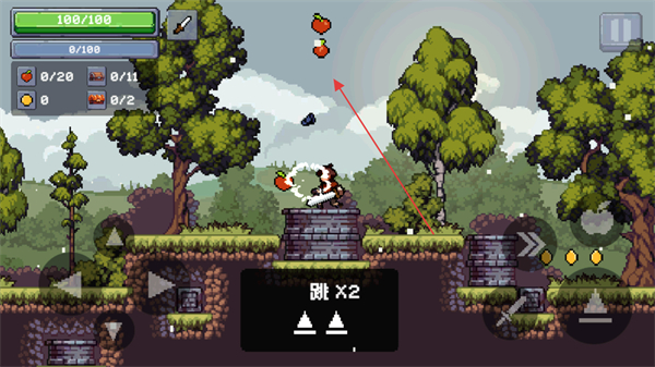 3、执行跳×2的二段跳操作,获取高处的苹果道具。