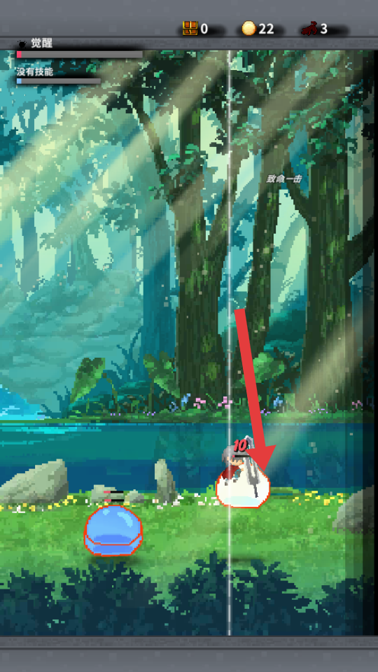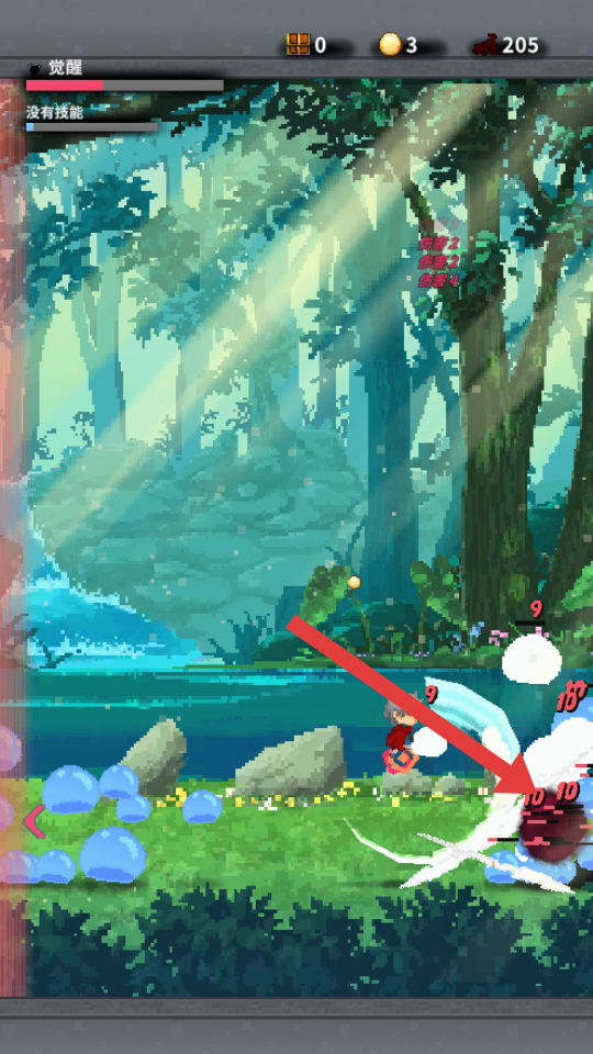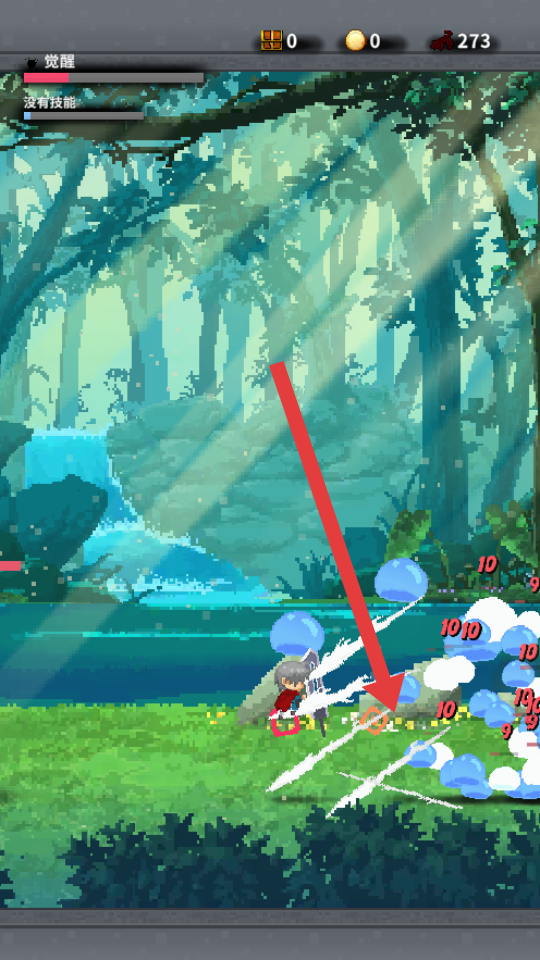 1、在森林场景中,遇到箭头指向的蓝色泡泡类敌人时,操控角色发起攻击,利用武器或技能对其造成伤害。