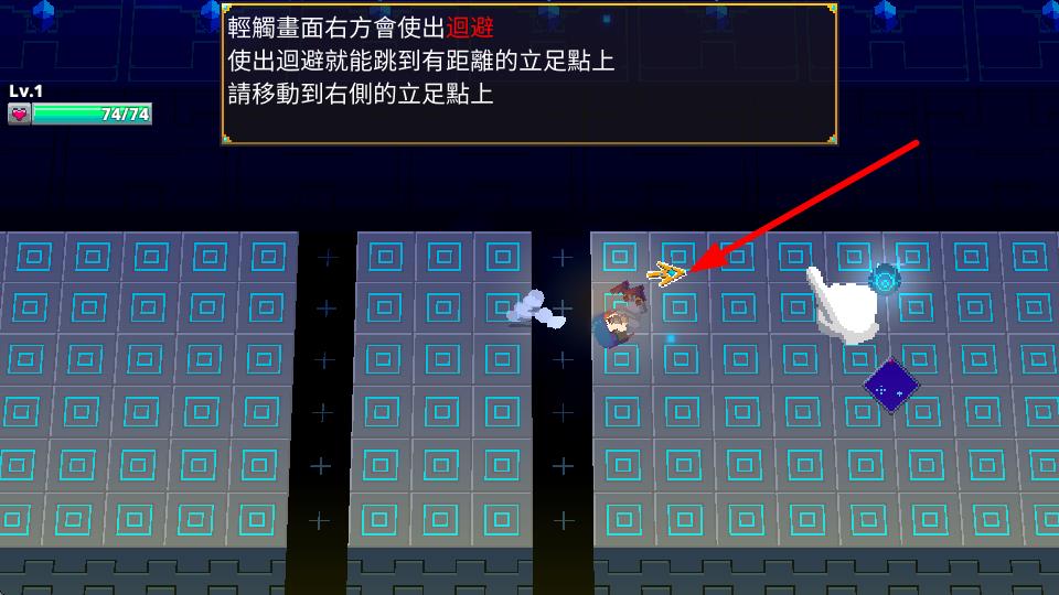 2、在游戏场景中,轻触画面右方可使出回避技能,使用该技能能跳到有距离的立足点上,按照提示移动右侧。