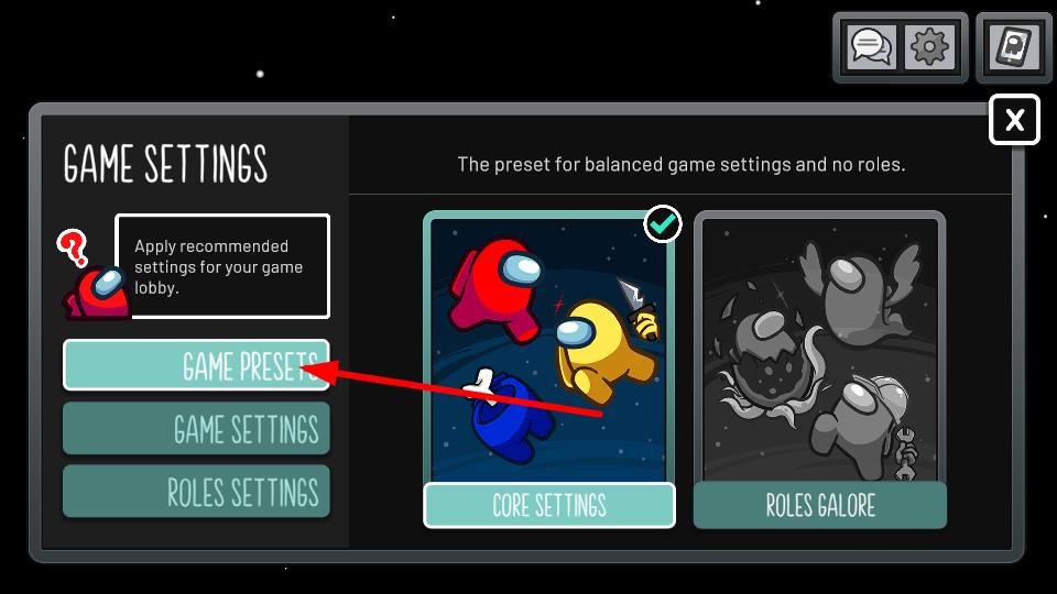 2、在房间界面,点击右侧EDIT按钮,进入“GAME PRESETS”选项,可选择游戏预设参数,比如调整内鬼数量、任务时间等。完成设置后返回房间主界面。