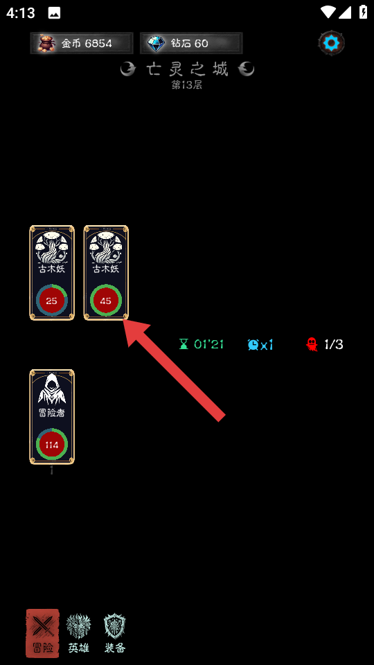 1、在亡灵之城第13层冒险时,遇到箭头指向的古木妖敌人,可选择与其战斗,击败敌人获取经验,推进地牢探索。