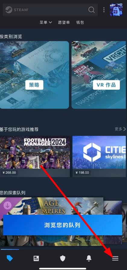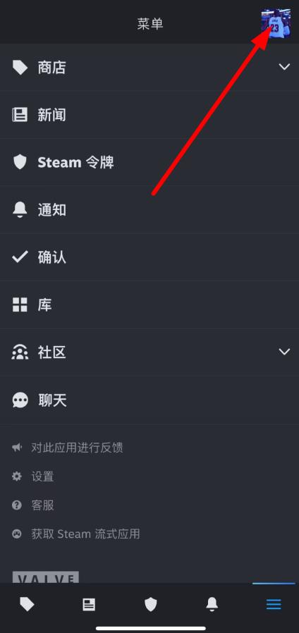 1、打开Steam应用,点击底部导航栏最右侧的三横线图标,进入菜单页面。