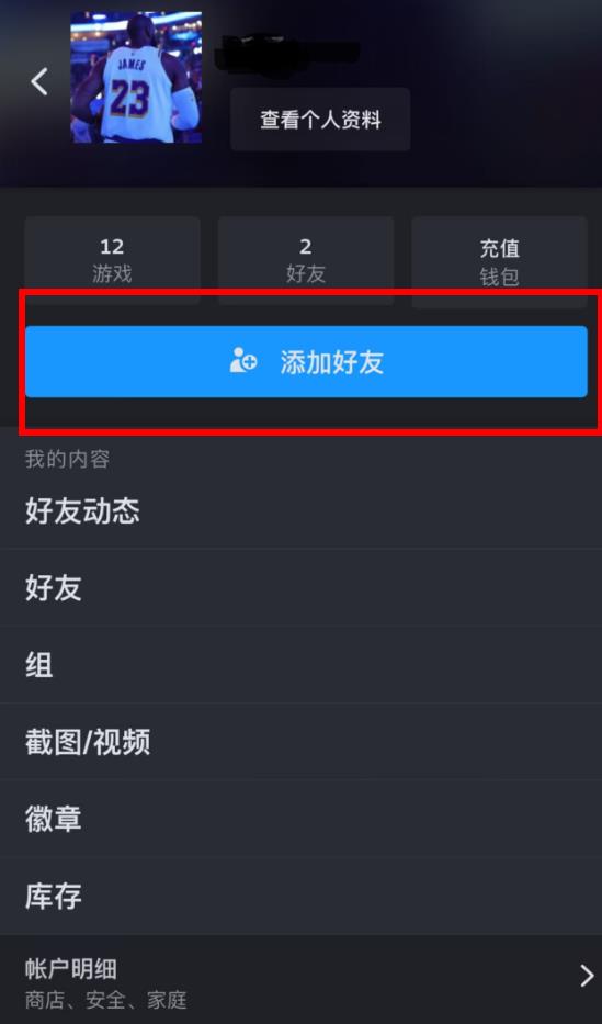 3、进入个人相关页面后,找到并点击添加好友按钮,之后可通过搜索好友昵称等方式,发送添加好友申请。