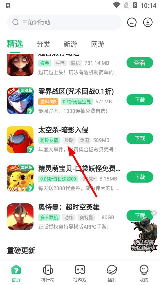 1、打开7723游戏盒APP,在精选页面浏览各类游戏,找到想玩的游戏,比如太空杀-暗影入侵。