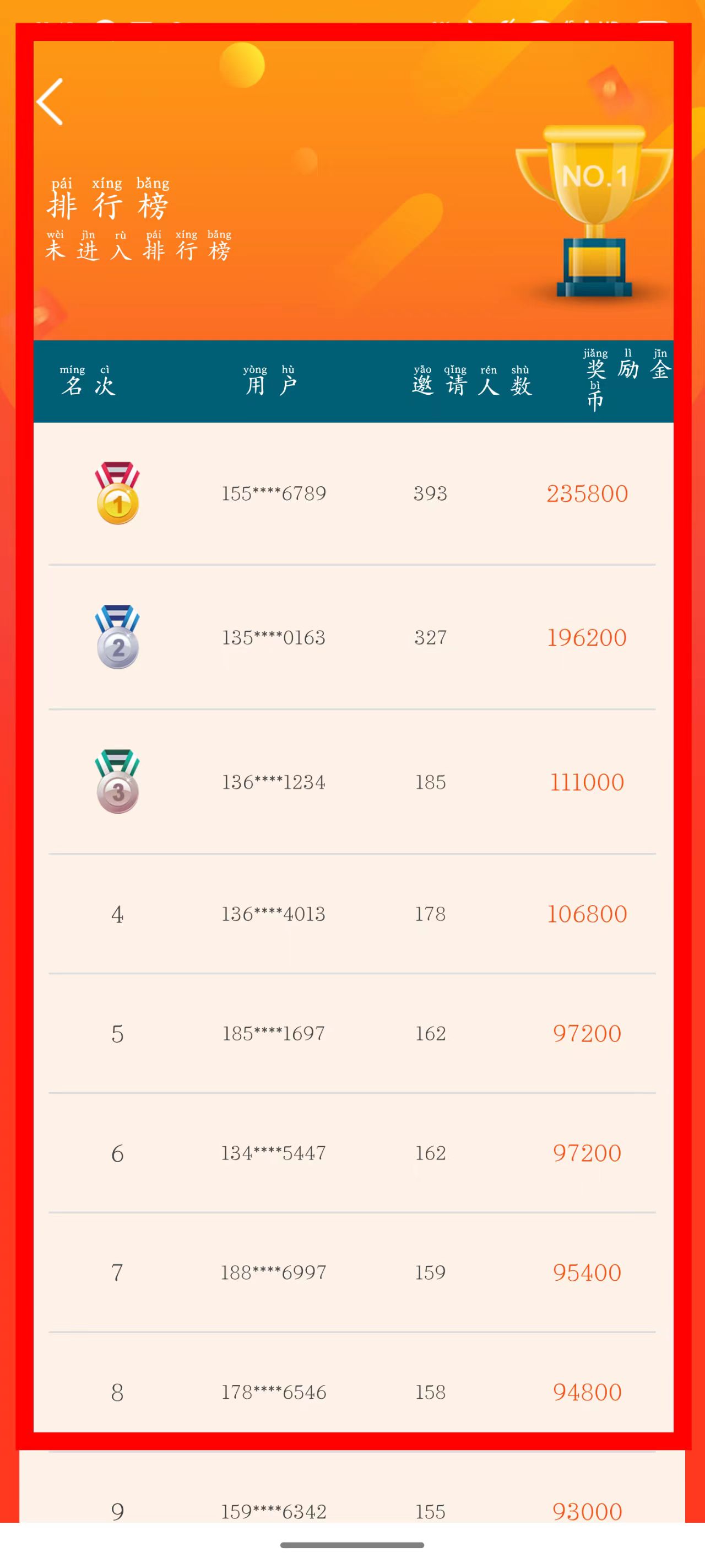 4、好友通过邀请链接下载APP并注册,在个人中心填入邀请码,此外点击邀请排行榜,能查看邀请排名及奖励情况。