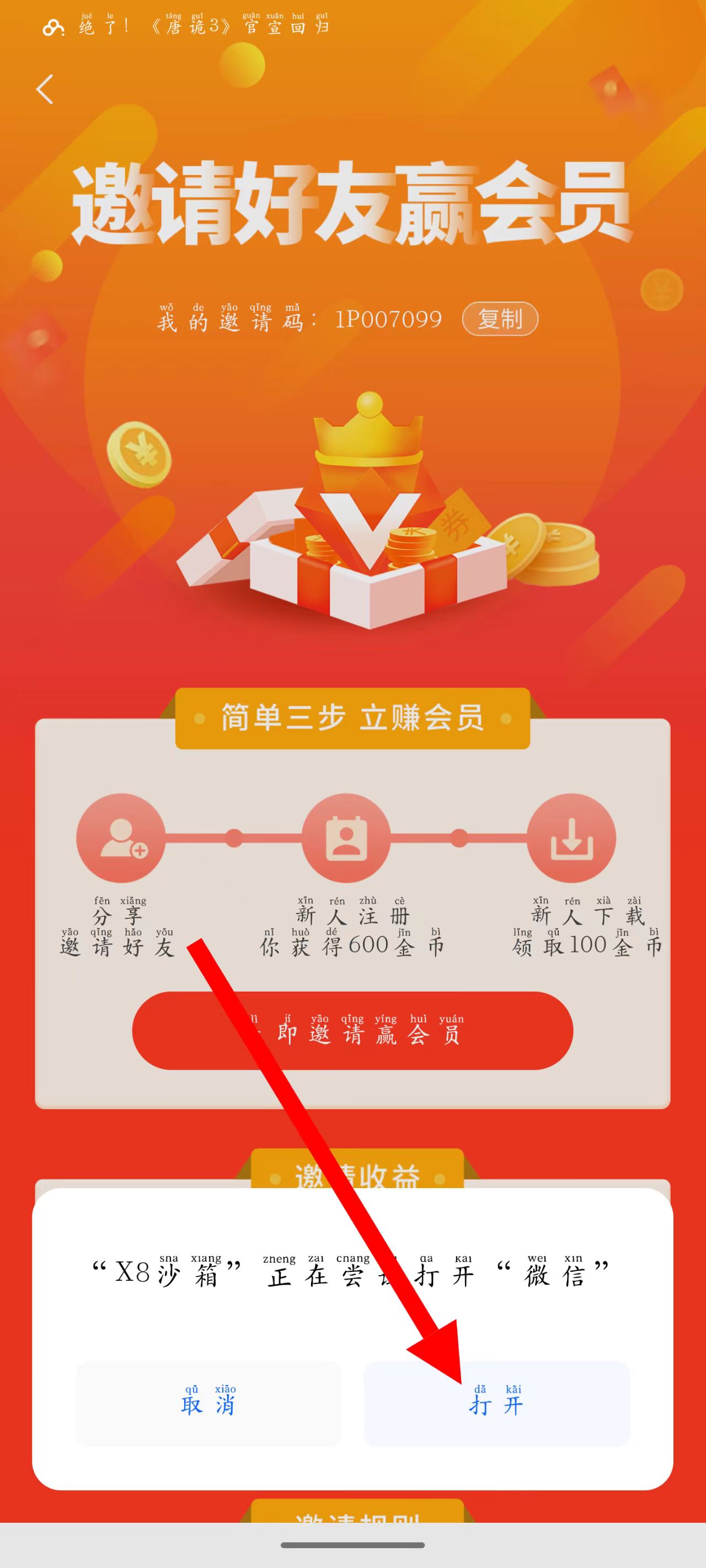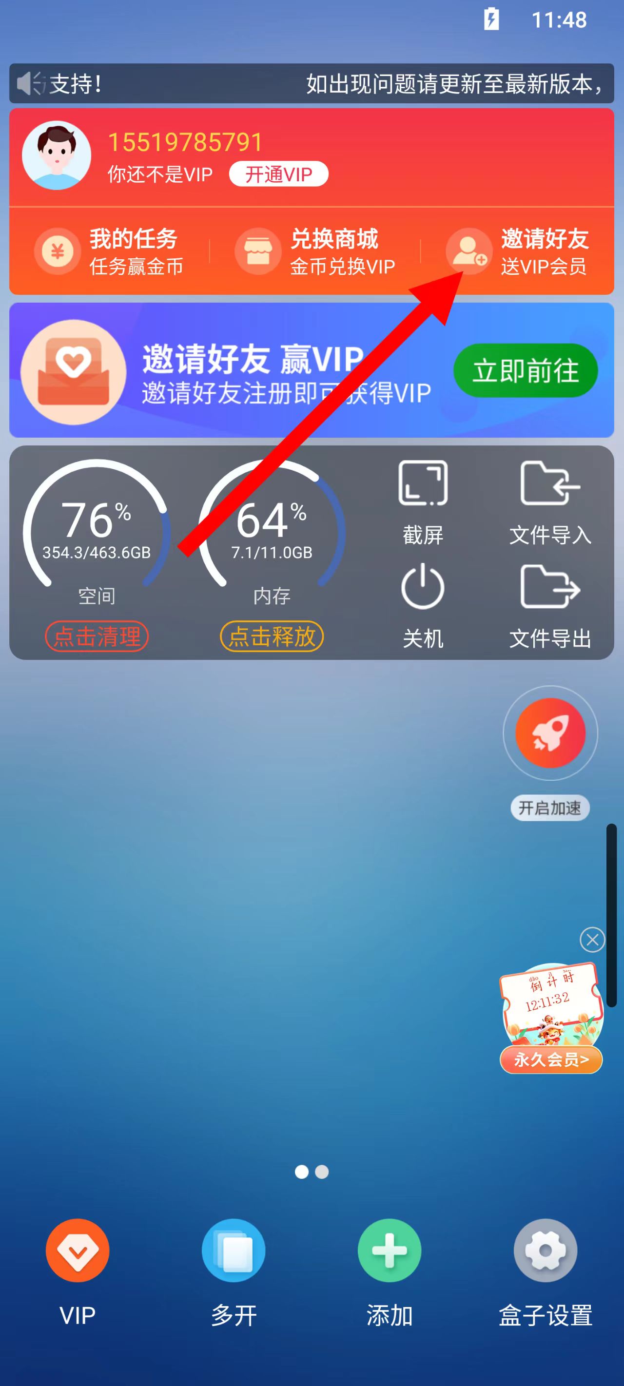1、打开x8沙箱应用,在主界面上方找到邀请好友送VIP会员点击进入。