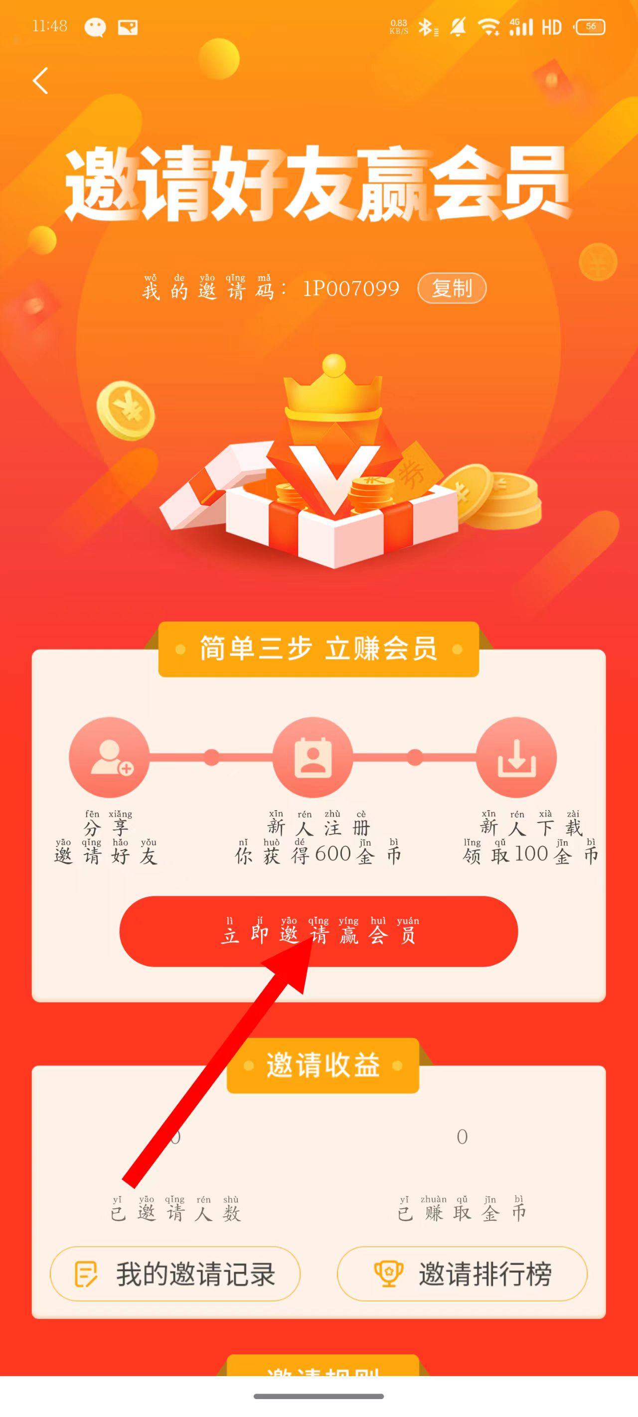 2、进入邀请界面后,可先复制自己的邀请码,再点击立即邀请赢会员按钮。