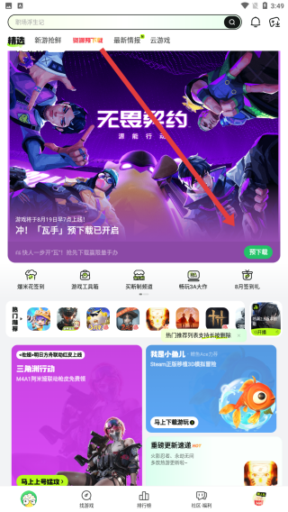 3、在应用顶部选择耐玩下载分类,浏览板块内容,找到无畏契约等游戏,点击“预下载”按钮准备安装游戏。
