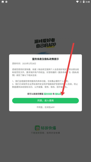 1、打开好游快爆相关应用,面对服务条款及隐私政策提示,点击绿色同意,进入使用按钮,完成协议确认后进入应用内界面。
